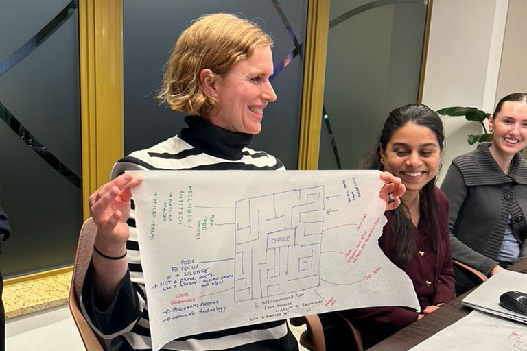 The non-AI group moved differently. They debated, had prolonged conversations and sat with uncertainty before arriving at an office imagined as a living maze, a dense, self-contained and full of life. It included spaces for deep focus, on-site farming, and quiet pockets alongside holograms representing remote colleagues. Less resolved, but unmistakably human.