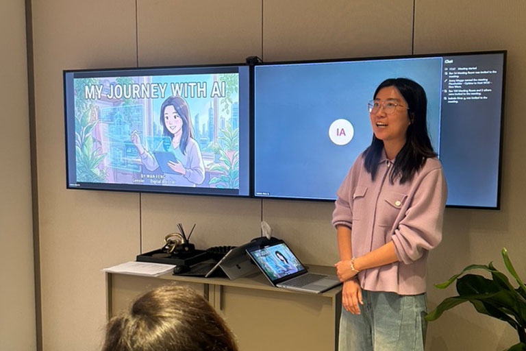 Wan Feng, AI Digital Artist at Gensler, closed the evening by grounding these ideas in her own journey. From experimenting with AI during her studies, to learning how the tools work under the hood, to stepping into a role that didn’t exist before she joined the firm, her work reframed AI not as a shortcut, but as a storytelling tool.
